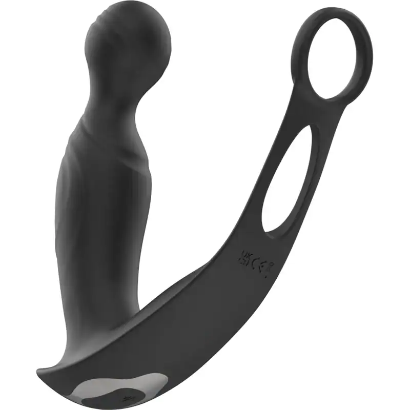 Vibrador estimulador prostático con control remoto, con anillo para pene y testículos, diseñado para placer intenso. Ofrece 9 modos de golpes y 9 de empuje, control remoto y APP opcional. Fabricado en silicona suave, con diseño impermeable para usar en cualquier momento. Medida: 15.8 x 3 cm.